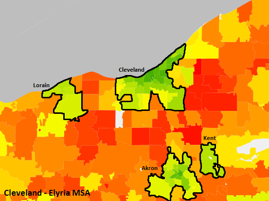 You can see this clearly in places like the Metro-Atlanta area. The Atlanta City center is a pocket of low-carbon emitting households (between 25-47 metric tons of CO2 per zip code) surrounded by a ring of high-carbon emitting suburbs (between 50-76 metric tons of CO2 per zip code). Cities across Ohio exhibit the same trend; looking at Akron, Cleveland and Columbus, the city centers and suburban communities are distinct based on their measures of carbon emissions.
